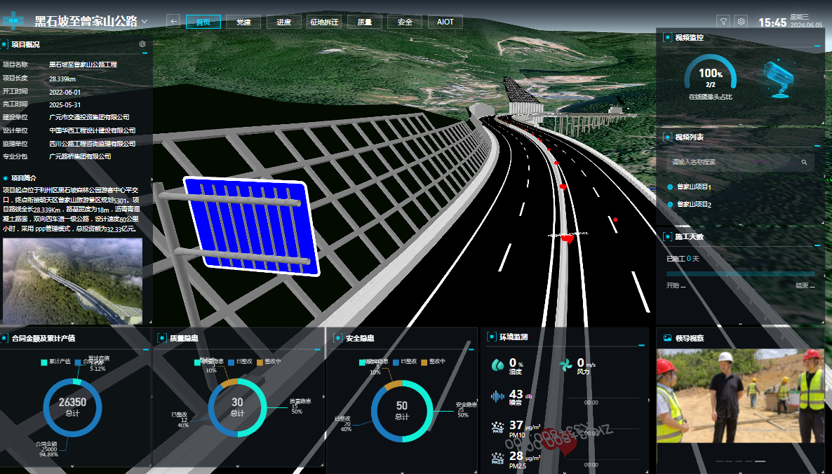 為強(qiáng)化風(fēng)險(xiǎn)管控,黑曾路項(xiàng)目部引入智慧信息化可視管理平臺(tái),綜合運(yùn)用BIM、GIS、物聯(lián)網(wǎng)、大數(shù)據(jù)、人工智能、無人機(jī)等先進(jìn)技術(shù),構(gòu)建基于BIM+GIS+IOT+AI+PM的智慧工地平臺(tái),實(shí)現(xiàn)進(jìn)度、質(zhì)量、安全等全方位智能化管控。