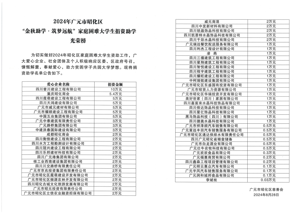 8月28日,昭化區(qū)舉行2024年“金秋助學(xué)·筑夢遠(yuǎn)航”家庭困難大學(xué)生資助儀式,路橋集團(tuán)作為資助企業(yè)參會(huì)并獲得表彰。